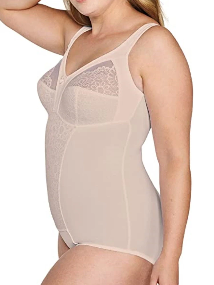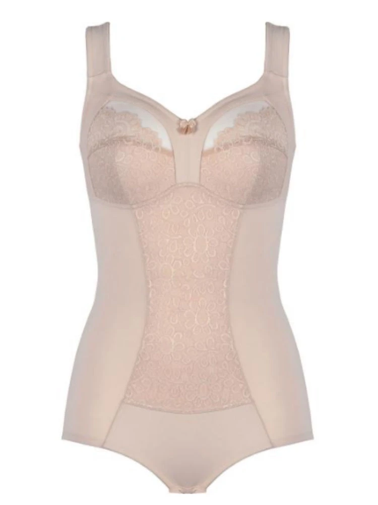 Soft Body from Naturana. Made with comfort as a priority, this slimming body provides a smooth finish under clothing. The non-padded four section cups give a natural shape, and support cup sizes from B-D. This body includes wide comfort straps and features playful lace detailing. The gusset is lined and has a hook and eye closure for maximum comfort.
